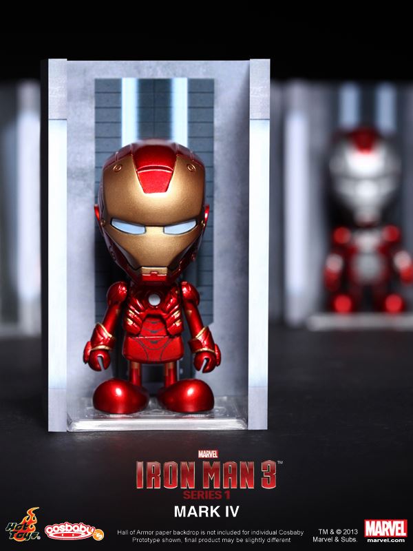characters in baby form and their unique designs in special format.Each set of Iron Man 3 Cosbaby (S) (Series 1) includes eight Cosbabies in window box, with the specially designed Hall of Armor paper backdrop and mini paper stage for fans to display them together like Tony Stark’s workshop.